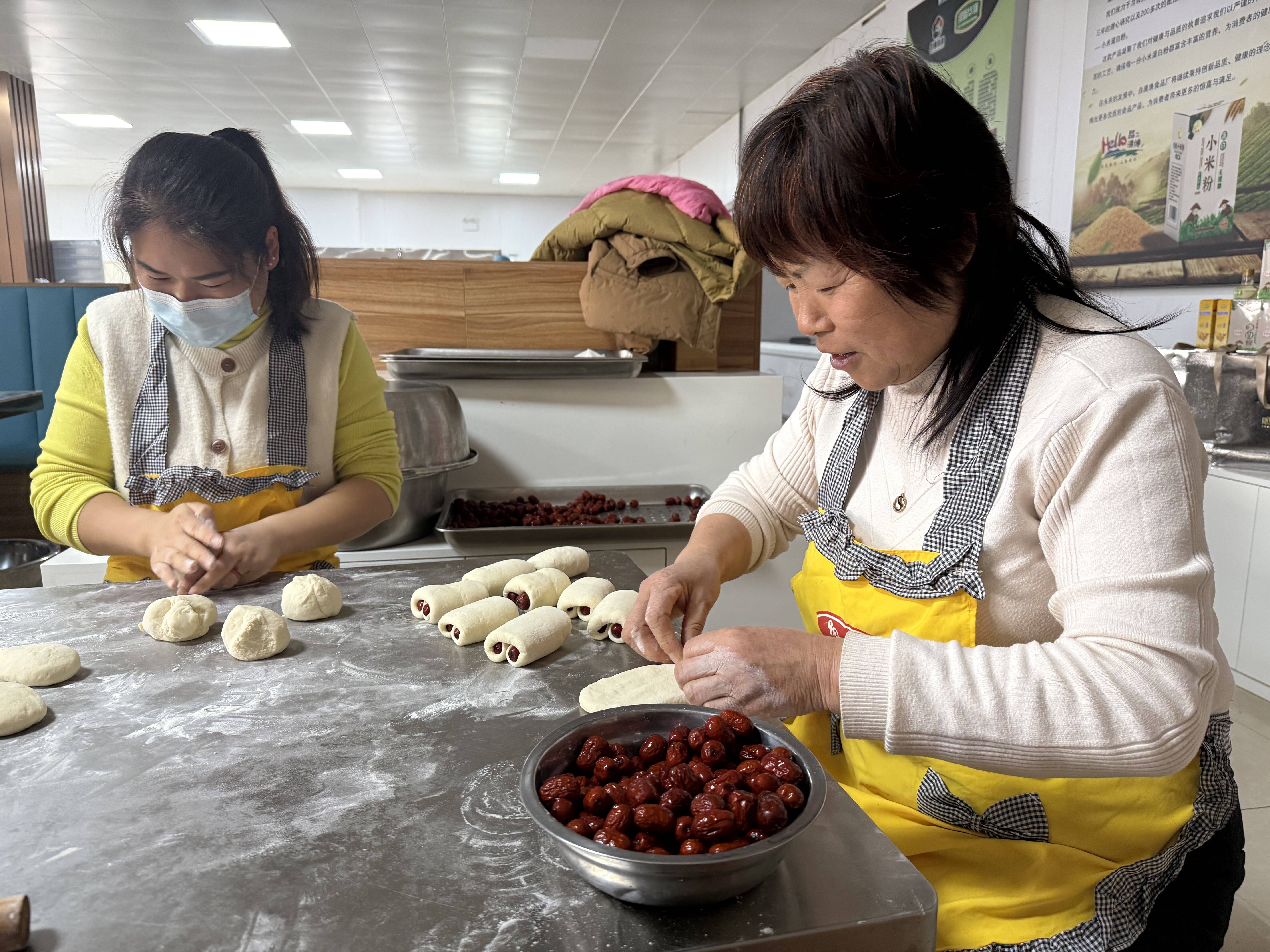 大家一边揉面、擀皮、嵌枣、塑形,把普通面团打造成吉祥可爱的花馍,一边分享技巧、唠着家常,邻里间的夸赞与帮扶,让整个食堂满是烟火气与巾帼温情。