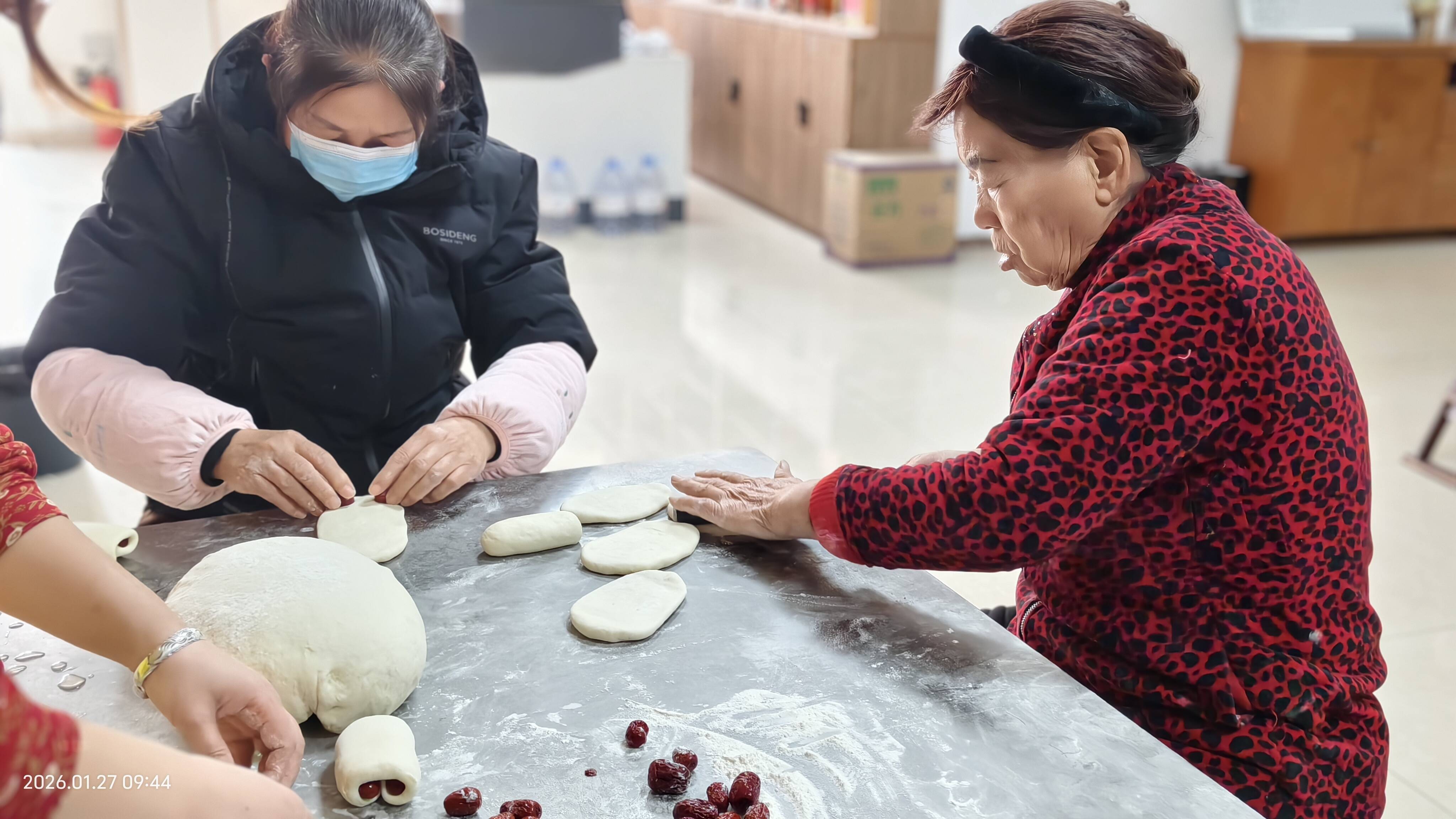 活动现场暖意融融,热闹非凡。操作台上,洁白的面团蓬松暄软,鲜红的大枣颗颗紧实,擀面杖、剪刀等工具整齐摆放,处处透着浓郁的年俗气息。大家围桌而坐,其乐融融,指尖跃动间满是对这场民俗体验的热忱。