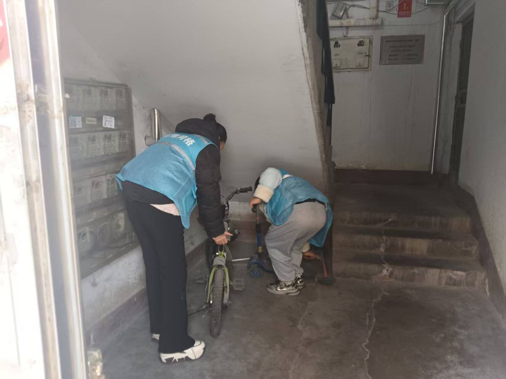 行动中,社区网格员与志愿者们逐栋逐单元排查,重点清理楼道内违规停放的电动车、自行车,以及堆积的纸箱、旧家具、闲置物品等杂物。在老旧楼栋的楼道里,工作人员合力将停放在消防通道的电动车移至指定停车区域;在高层住宅的楼梯间,大家弯腰清理堆积在转角处的杂物,不放过任何一处卫生死角。清理过程中,工作人员同步向居民宣传消防安全知识,讲解电动车违规停放、楼道堆物的安全隐患,引导居民自觉维护公共空间秩序,让“楼道清、人心安”的理念深入人心。