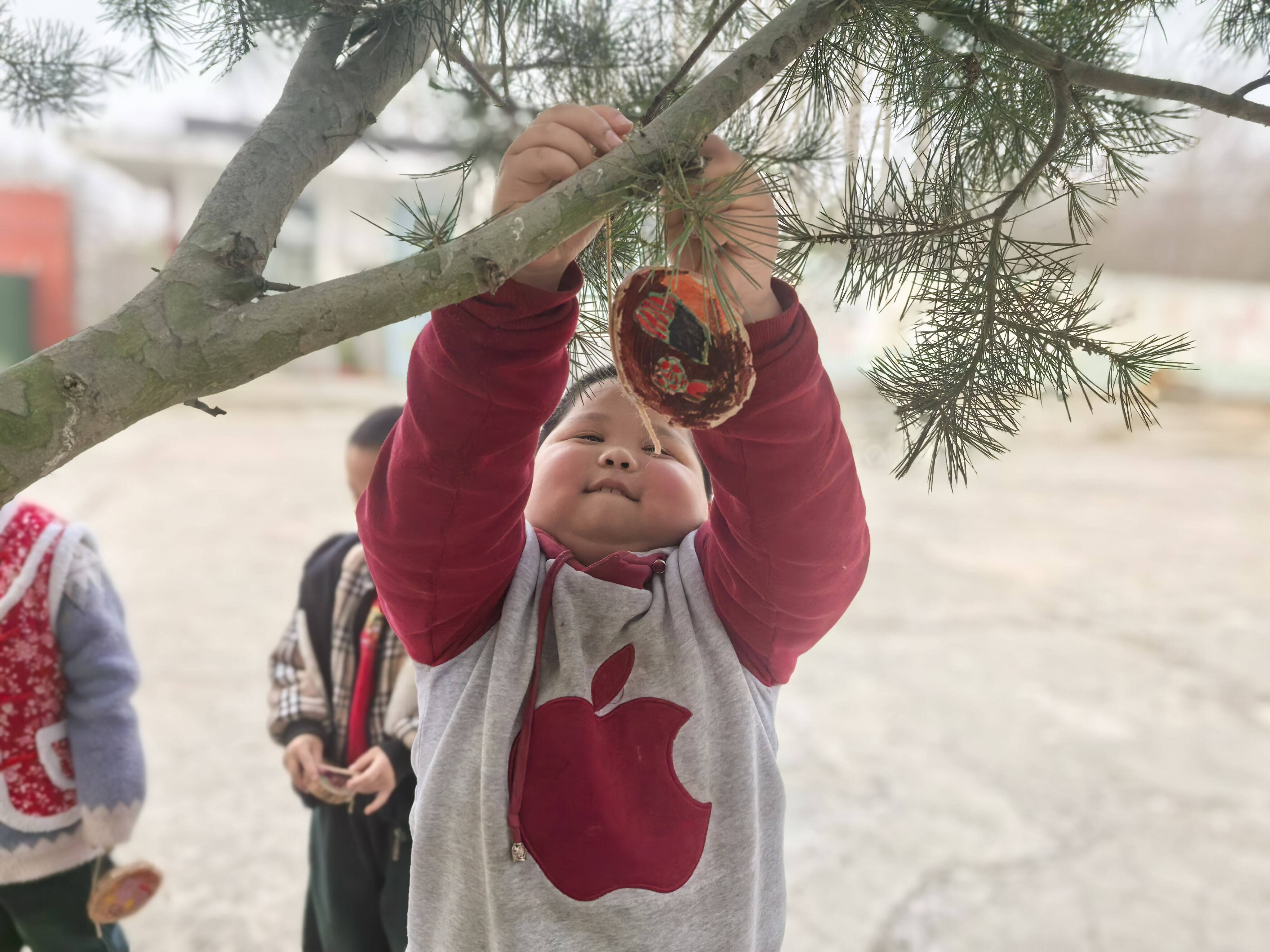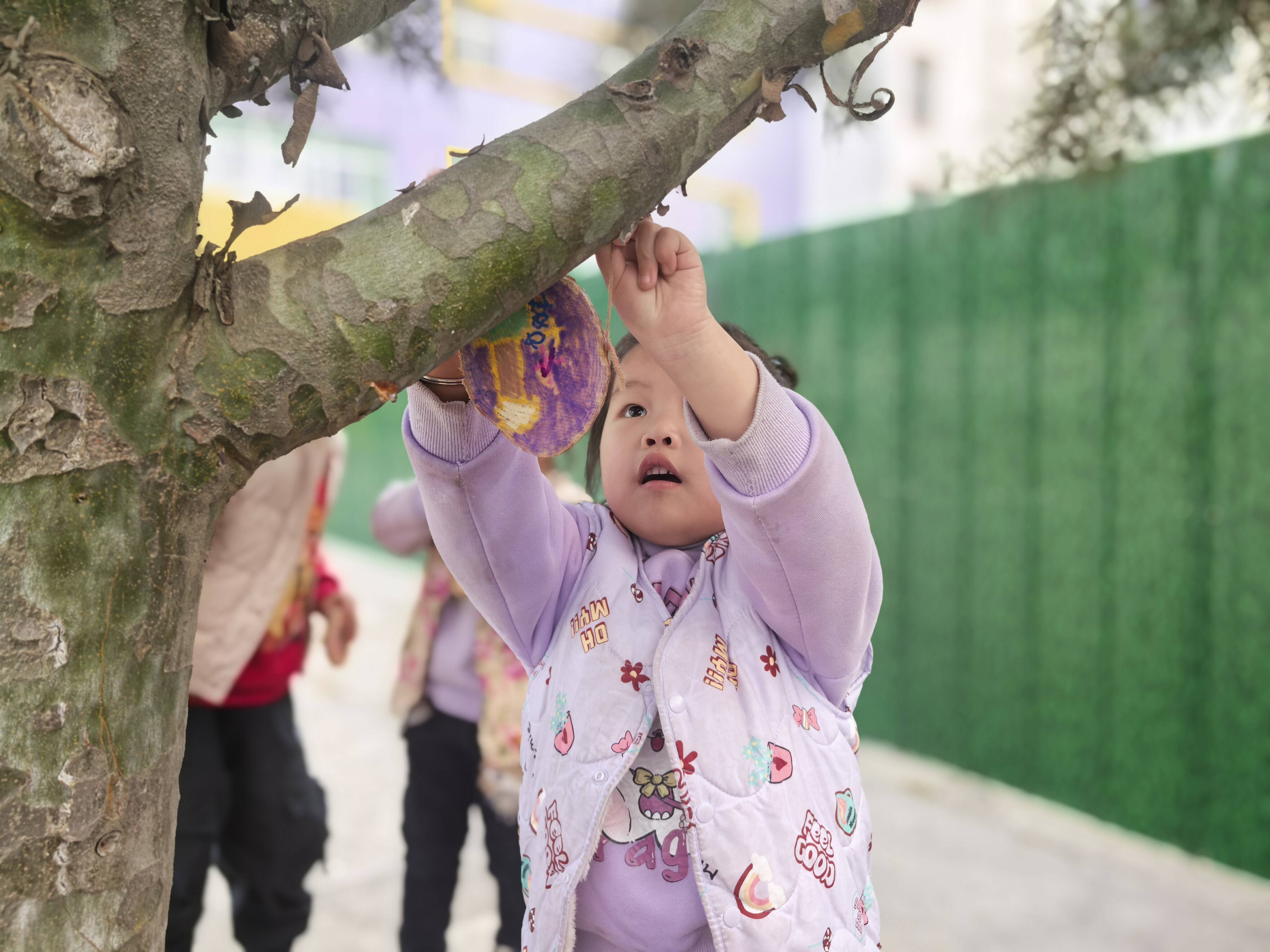 在树牌创作环节,孩子们以木片、纸盘为画板,用稚嫩的笔触绘制出形态各异的图案:有的画上笑脸与太阳,有的涂满翠绿的枝叶。制作完成后,他们小心翼翼地将专属树牌悬挂在校园的树枝上,微风拂过,树牌轻轻摇曳,与嫩芽新叶相映成趣。从精心绘制到亲手悬挂,每一个动作都饱含着孩子们对自然的纯真爱意,也让爱护环境的意识随着这些摇曳的树牌,在心中悄然生根。